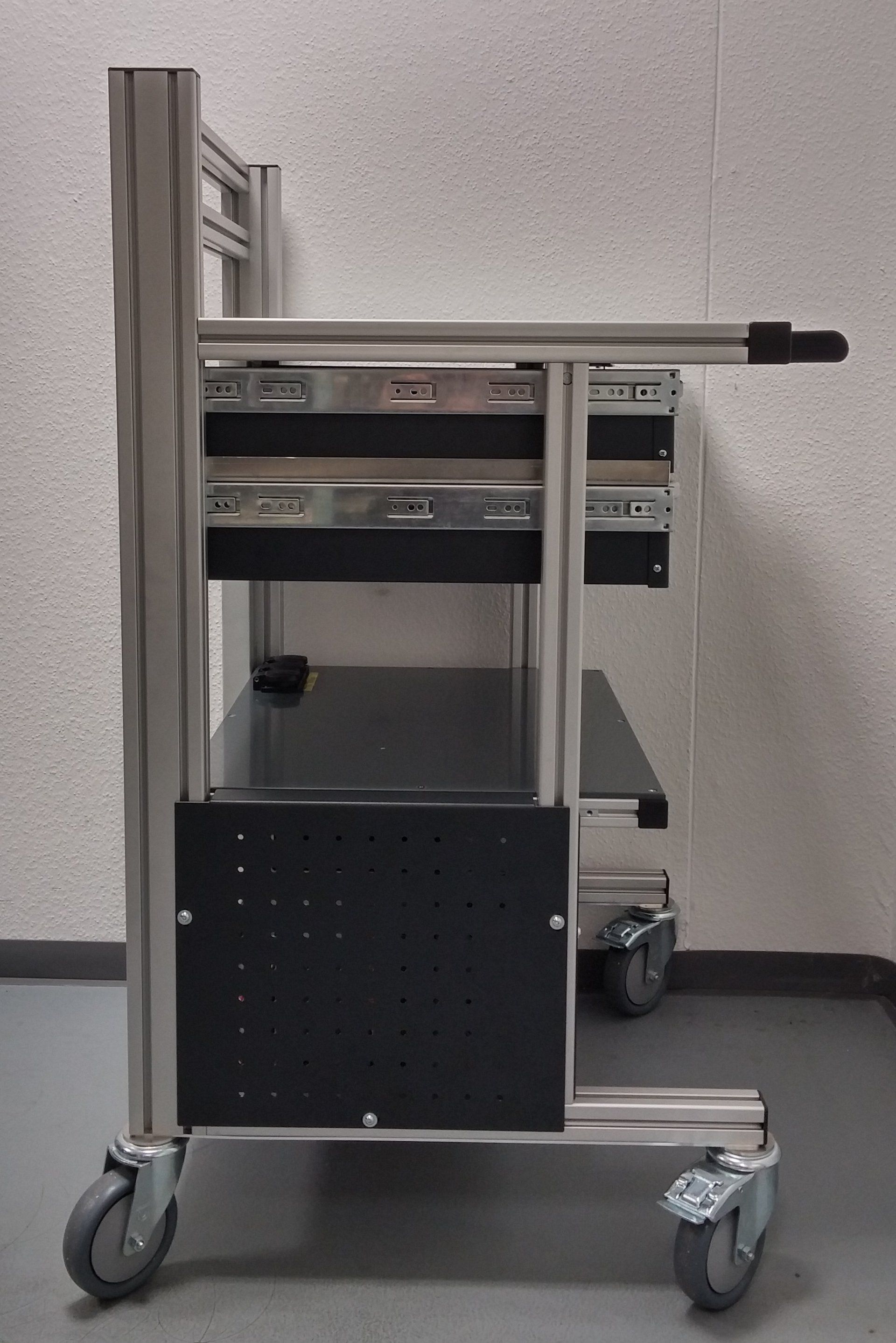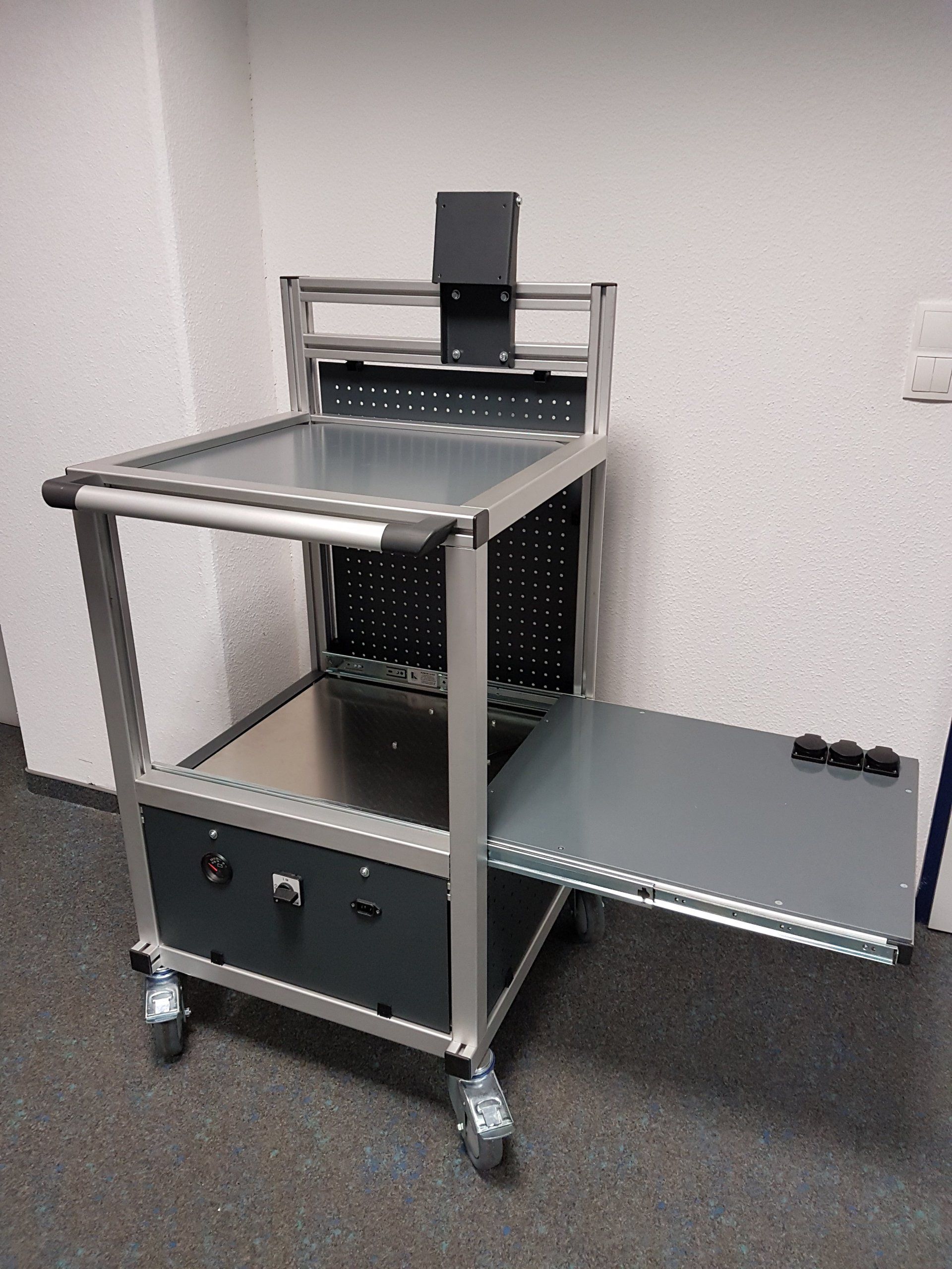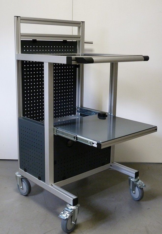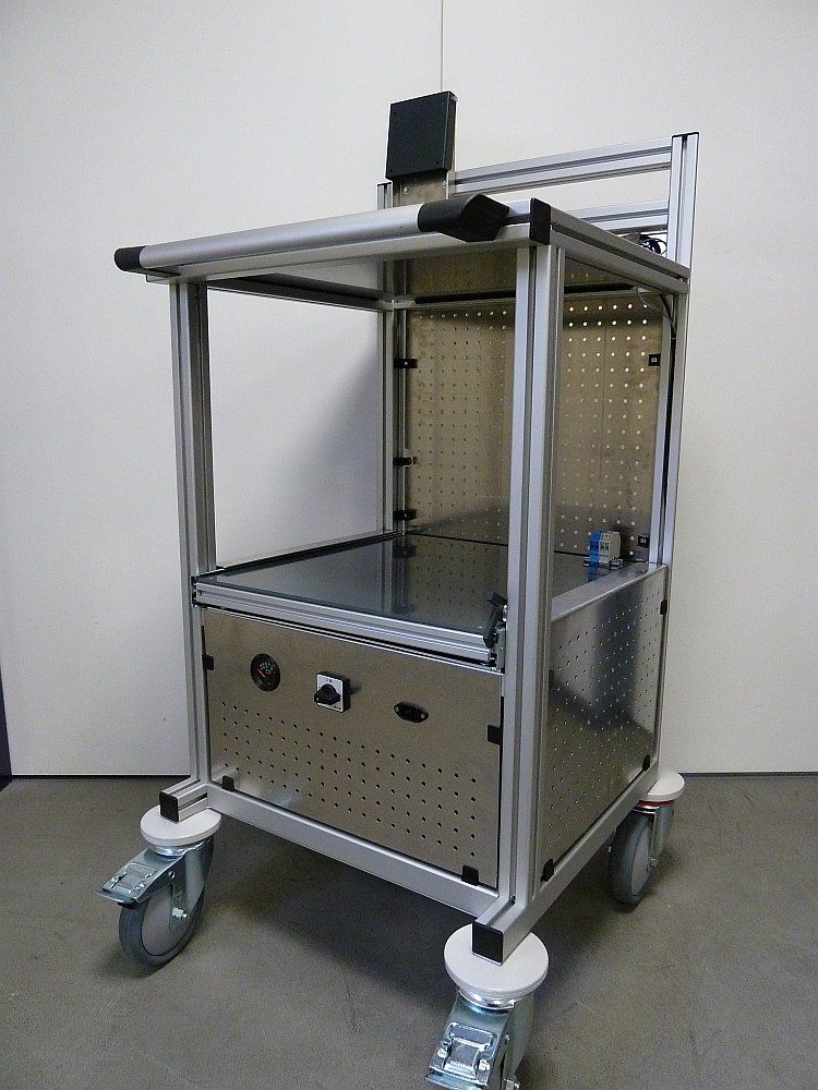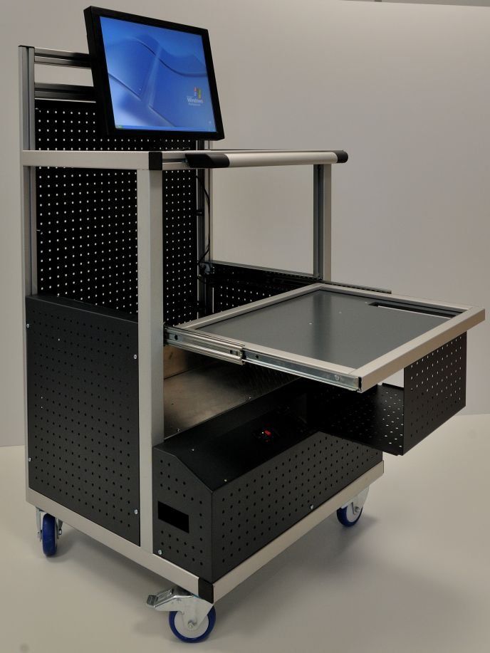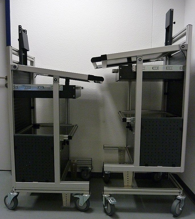 Eine Besonderheit des MobiWa der KSC ist die Ausstattung mit ultraleichten Lithium-Ionen-Akkus, die wir auf Kundenwunsch vornehmen. Je nach Anforderungen erreicht unser mobiler Arbeitsplatz sie ausgerüstet mit ergänzenden Produkten der KSC wie Barcodescannern, Schubladen, zusätzlichen Ablagen, Etikettendruckern oder Akkuwechselvorrichtungen aus. Entsprechende Informationen hierzu finden Sie in unserem Zubehörsortiment. Aus robusten Aluminiumprofilen gefertigt, hat unser mobiler Arbeitsplatz MobiWa einen sicheren Stand und ist mit Hilfe von großen Rollen leicht zu bewegen. Für den Food- und Pharmabereich ist eine Variante in Edelstahlprofilausführung verfügbar.