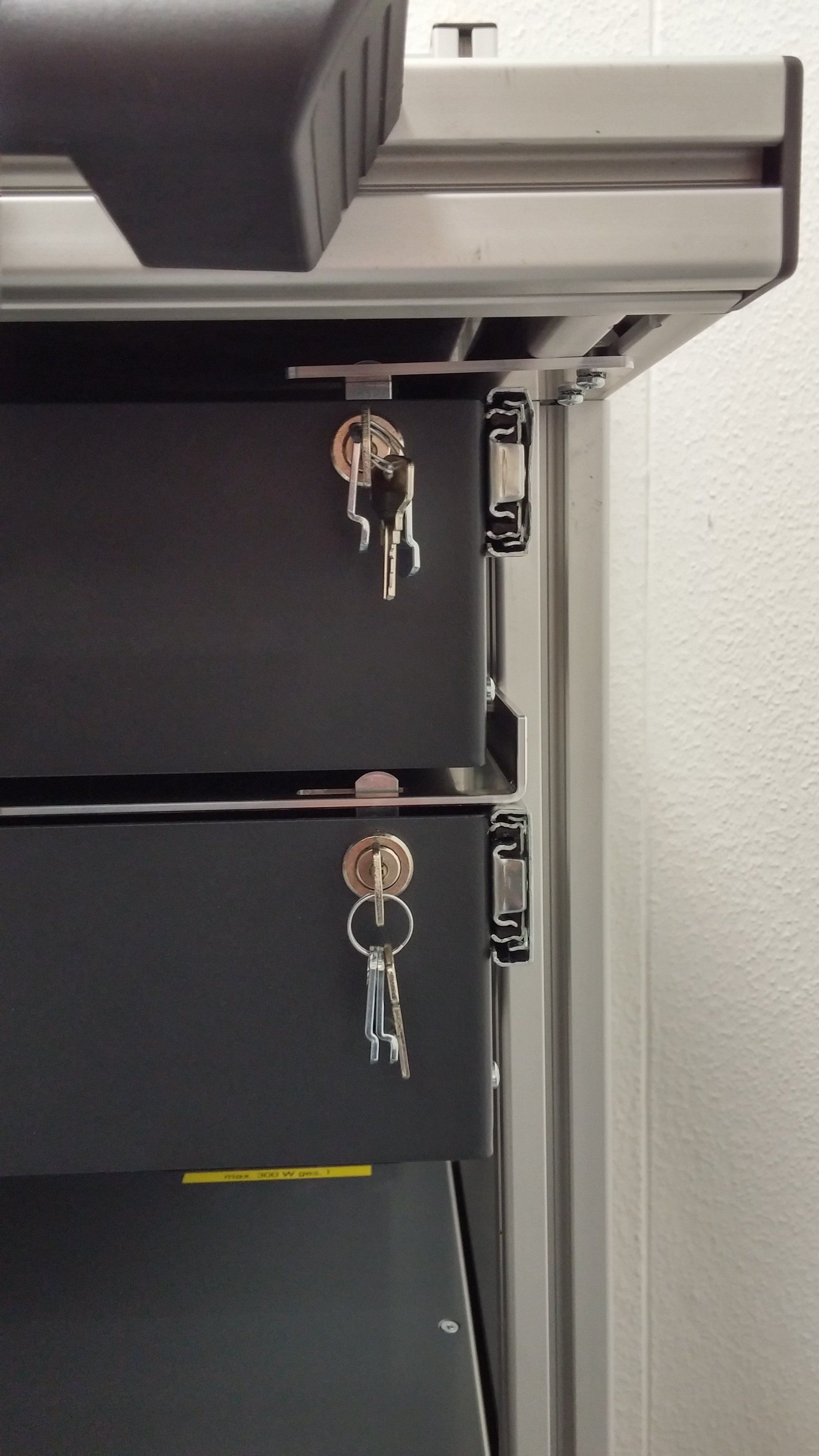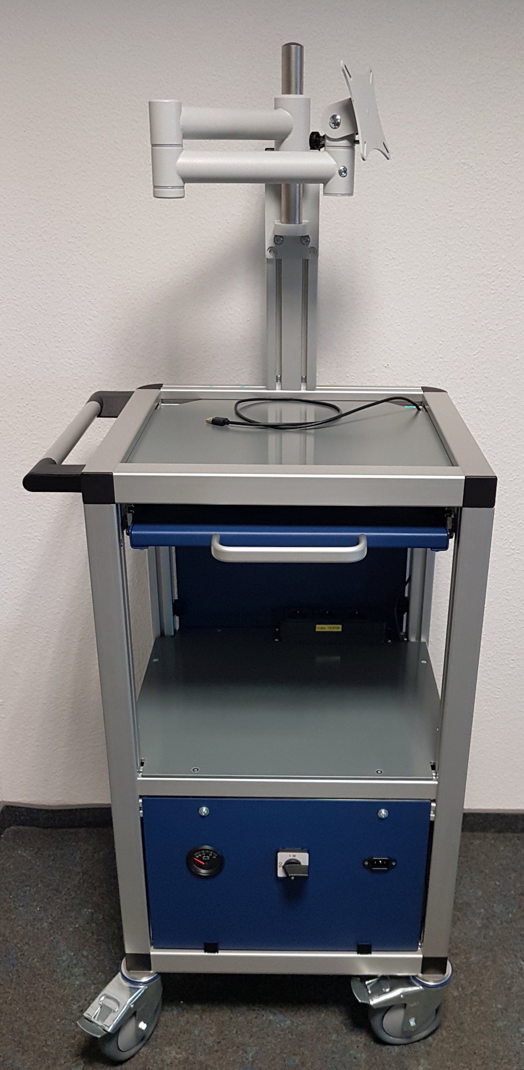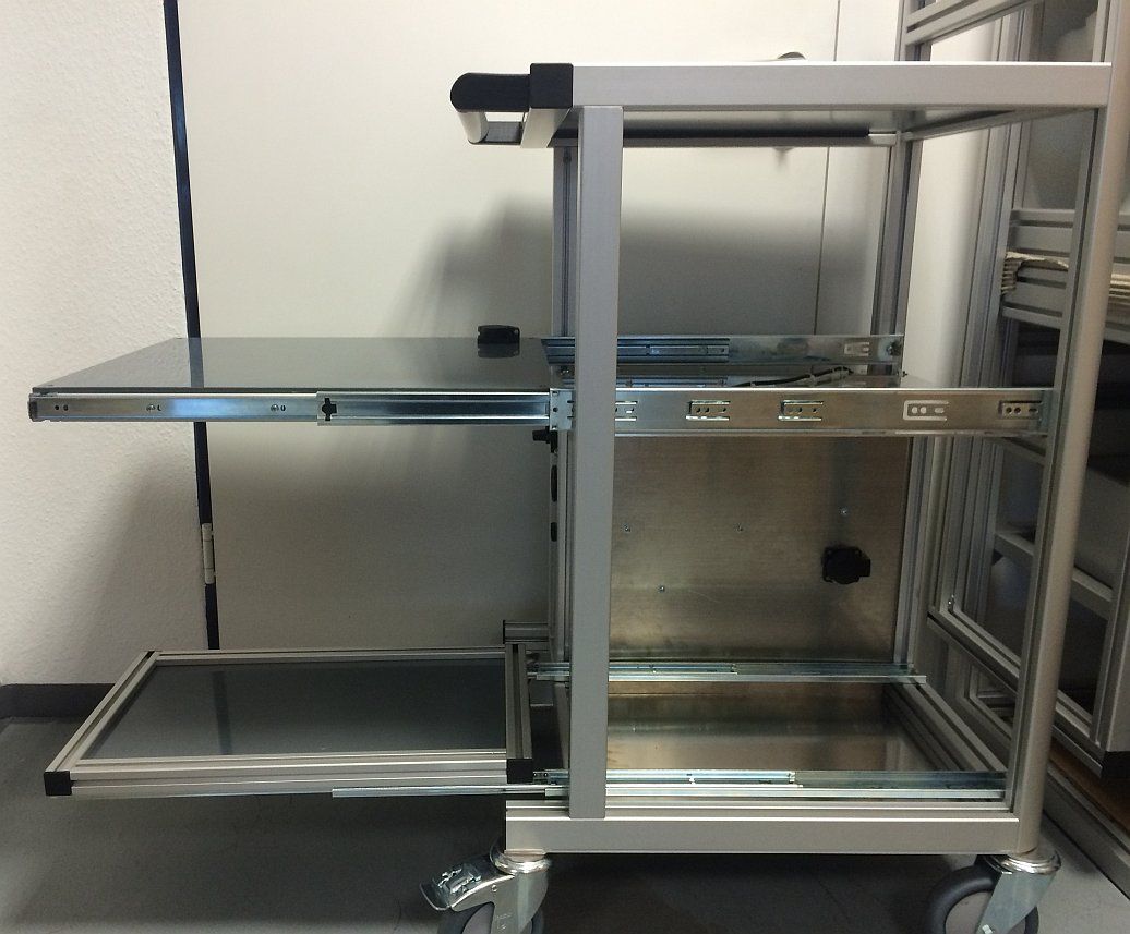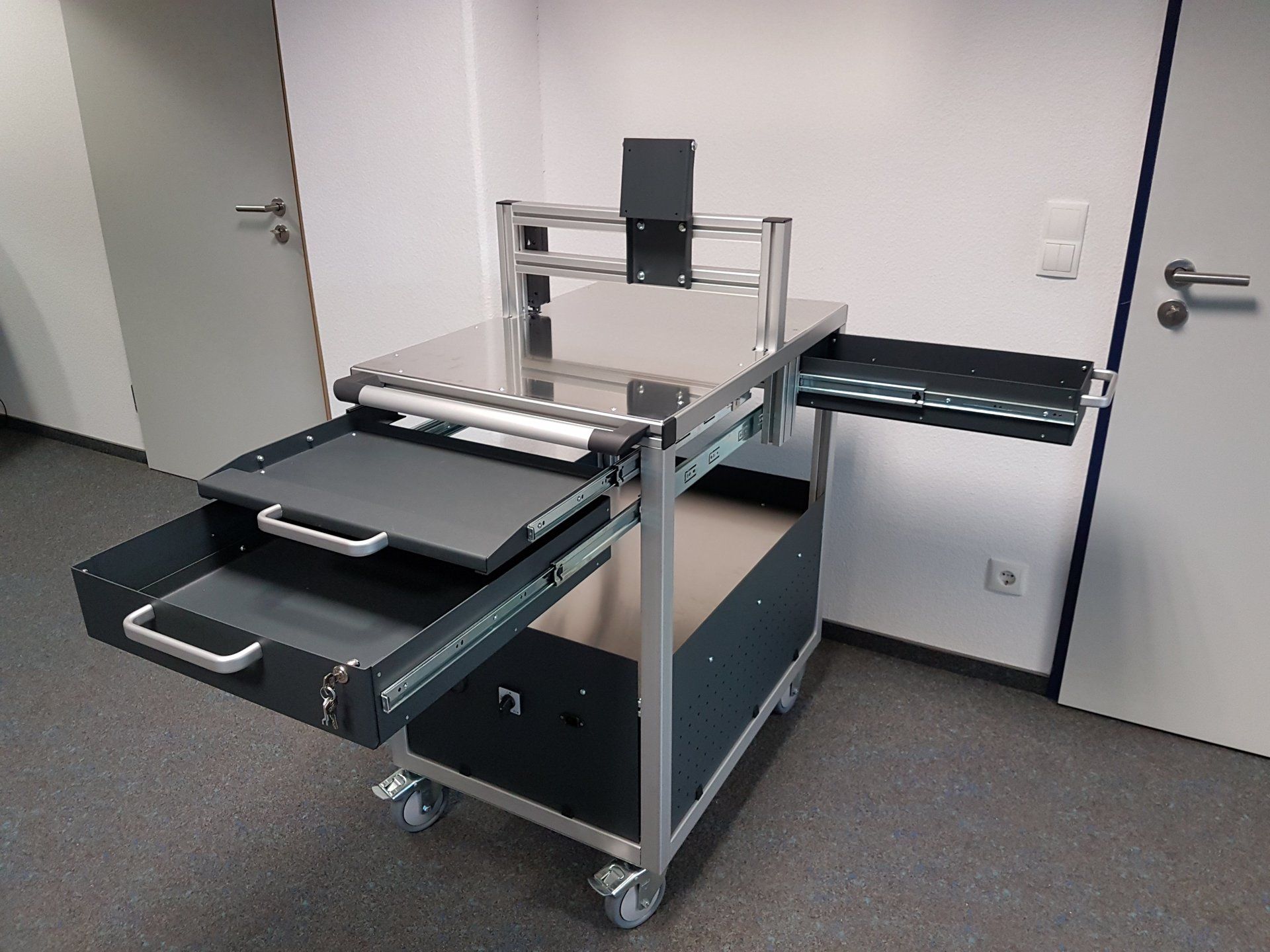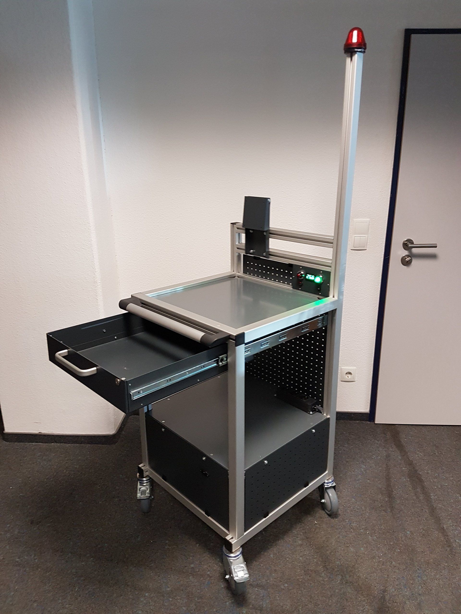 Eine Besonderheit des MobiWa der KSC ist die Ausstattung mit ultraleichten Lithium-Ionen-Akkus, die wir auf Kundenwunsch vornehmen. Je nach Anforderungen erreicht unser mobiler Arbeitsplatz sie ausgerüstet mit ergänzenden Produkten der KSC wie Barcodescannern, Schubladen, zusätzlichen Ablagen, Etikettendruckern oder Akkuwechselvorrichtungen aus. Entsprechende Informationen hierzu finden Sie in unserem Zubehörsortiment. Aus robusten Aluminiumprofilen gefertigt, hat unser mobiler Arbeitsplatz MobiWa einen sicheren Stand und ist mit Hilfe von großen Rollen leicht zu bewegen. Für den Food- und Pharmabereich ist eine Variante in Edelstahlprofilausführung verfügbar.