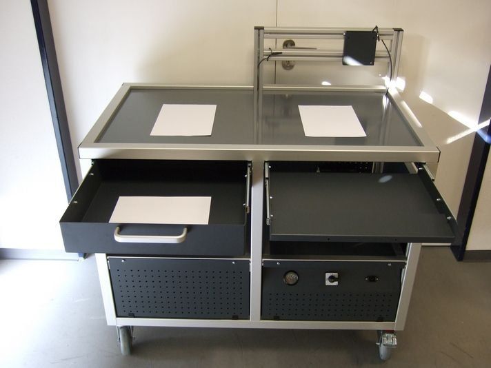 Eine Besonderheit des MobiWa der KSC ist die Ausstattung mit ultraleichten Lithium-Ionen-Akkus, die wir auf Kundenwunsch vornehmen. Je nach Anforderungen erreicht unser mobiler Arbeitsplatz sie ausgerüstet mit ergänzenden Produkten der KSC wie Barcodescannern, Schubladen, zusätzlichen Ablagen, Etikettendruckern oder Akkuwechselvorrichtungen aus. Entsprechende Informationen hierzu finden Sie in unserem Zubehörsortiment. Aus robusten Aluminiumprofilen gefertigt, hat unser mobiler Arbeitsplatz MobiWa einen sicheren Stand und ist mit Hilfe von großen Rollen leicht zu bewegen. Für den Food- und Pharmabereich ist eine Variante in Edelstahlprofilausführung verfügbar.